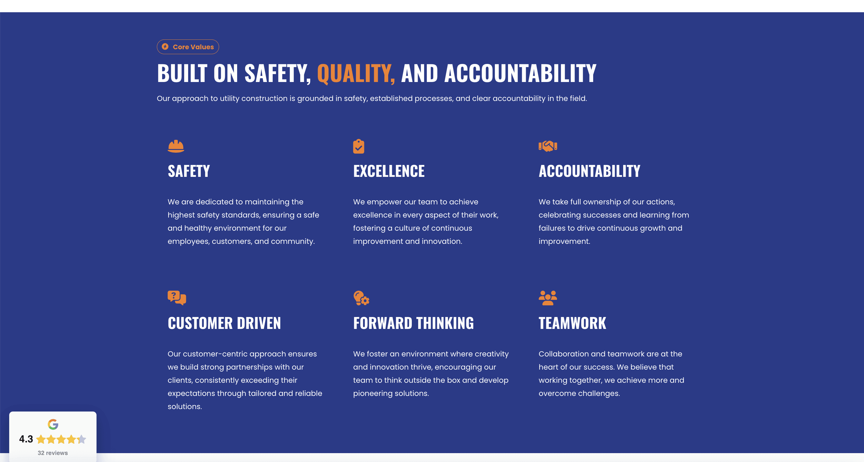 What I Did Redesigned the site with a stronger visual hierarchy, bolder use of brand colors, and clearer content organization. Introduced dedicated sections for services, company values, team, service area, FAQs, and customer testimonials to build trust and guide prospective clients toward contact. Refined typography, iconography, and image treatment throughout for a more professional, industry-appropriate look and feel.
